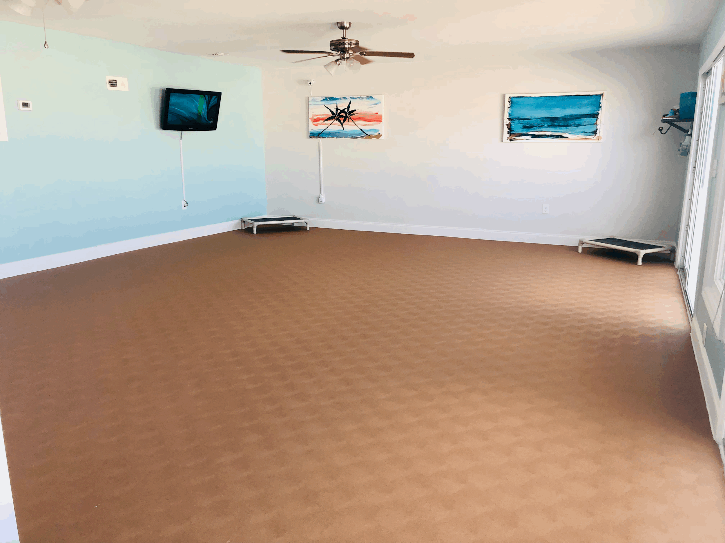 A very spacious living quarters designed with the island life in mind. Each boarding room consists of multiple condo-like doggy bedrooms that features a therapeutic Kuranda bed with a comfy topper mattress, a plush blanket, a toy or two of their choice and personal doggy dishes.
